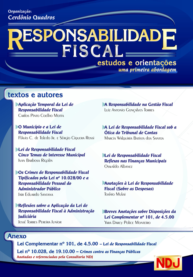 “A lei Complementar n° 101/00, de Responsabilidade Fiscal, é na verdade, um instrumento necessário para o início de uma nova concepção de aplicação das Receitas Públicas, no seu direcionamento visando a tão esperada transparência pela sociedade brasileira. Passado o impacto de sua edição, e tida por alguns segmentos como lei rigorosa, controladora, intervencionista das e nas ações dos administradores públicos, já estamos no caminho de uma construção doutrinária buscando a melhor interpretação de seus preceitos, muitos realmente controvertidos, mas com vistas, sempre, a uma aplicação eficaz. Desde maio de 2000 vimos assistindo a uma intensa mobilização nacional envolvendo administradores, juristas, economistas, orçamentistas e contabilistas públicos, que, juntamente com Tribunais de Contas e entidades as mais diversas, vêm promovendo grandes debates. Até o momento, 6 (seis) ações diretas de inconstitucionalidade foram ajuizadas no Supremo Tribunal Federal questionando quase duas dezenas de dispositivos da Lei (veja a seguir as ADIns.) para uma reflexão. Estes movimentos, que acompanhei de perto e, inclusive, tendo participado de vários deles, além dos simpósios realizados pela NDJ, levaram-me a organizar esta obra com a participação de juristas especializados em Direito Público, economistas, contabilistas e orçamentistas públicos, para oferecer ao leitor uma visão eclética e amadurecida – e que, mesmo assim, resolvi chamar de “uma primeira abordagem”, pois aqui estão subsídios valiosos para uma construção doutrinária, ciente de que novas interpretações vão surgindo e de que, brevemente, teremos uma lei completamente assentada. Quem ganhará, certamente, serão os administradores e os administrados. Capítulo especial foi elaborado sobre a Lei n° 10.028/00, que contempla os crimes contra as finanças públicas e a responsabilidade pessoal dos administradores. Esta contribuição dos autores que atenderam ao meu convite, e a quem externo os meus agradecimentos, permitiu à NDJ, mais uma vez, prestar um serviço edificante para as instituições nacionais. Em anexo estão as duas leis anotadas e referenciadas pela Consultoria NDJ, mais uma vez, prestar um serviço edificante para as instituições nacionais. Em anexo estão as duas leis anotadas e referenciadas pela Consultoria NDJ, objetivando maior facilidade de consulta e compreensão.”