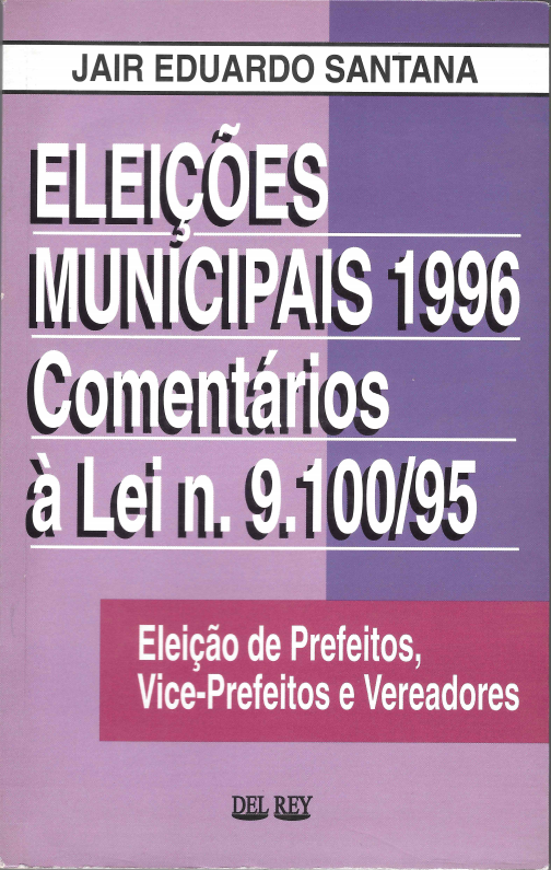 A Livraria Del Rey Editora tem a satisfação de publicar a obra do Mestre em Direito do Estado, Magistrado e Juiz Eleitoral, Dr. Jair Eduardo Santana, que trata especificamente das eleições de 1996, nas quais serão eleitos mais de 5 mil Prefeitos e Vice- Prefeitos e outros milhares de Vereadores. O livro cuida de comentar a Lei n. 9.100/95, artigo por artigo, de modo rápido e conciso, analisando as diversas e intricadas questões que se coloca nesse ramo jurídico. O trabalho, diz o Autor, é fruto de anotações e meditações, na lida diária da judicatura eleitoral. Integram- no, além da Lei citada, as Resoluções editadas pelo Tribunal Superior Eleitoral, o que se fez com o propósito único de reunir, num só volume, todos os atos normativos de interesse das mencionadas eleições. Não é preciso ressaltar a sua importância. O momento está a exigir de todos aqueles que, de algum modo, estejam envolvidos no pleito de 1996, o conhecimento das regras que irão nortear a escolha dos ocupantes das Casas de Leis e Prefeituras Municipais. É obra de interesse direito para candidatos, ocupantes ou não de cargos políticos, agremiações partidárias, advogados, assessores, magistrados, promotores de justiça, dentre outros tantos.