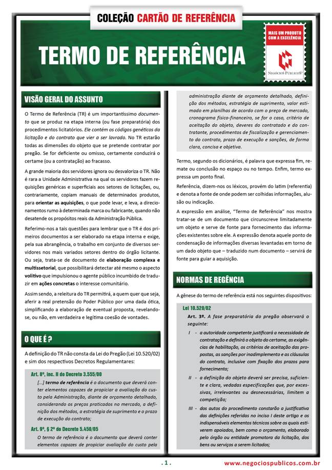 Muitos daqueles que transitam pelo setor das aquisições e contratações públicas (licitações e contratos administrativos) não se dão conta de que os principais e mais graves problemas existentes estão no nascedouro de tais procedimentos. Licitações desertas e fracassadas, aquisições de péssima ou duvidosa qualidade, dimensionamento equivocado de demandas, aditivos contratuais desnecessários e excessivos e, enfim, deficiências finalísticas de toda sorte são decorrência – não raro – da ausência absoluta de planejamento, onde está a raiz do Termo de Referência e do Projeto Básico. Delimitar o objeto em todas as suas dimensões, com precisão cirúrgica, é o grande salto que a Administração Pública deve dar em busca da eficiência em seus processos. Este livro, até então inédito no País, aborda os principais temas para que a ótima especificação do objeto seja o caminho para o sucesso e para a geração dos ótimos resultados nas aquisições públicas. De fato, é no Termo de Referência ou no Projeto Básico que se encontram os códigos genéticos da licitação ou do contrato que vier a ser lavrado.